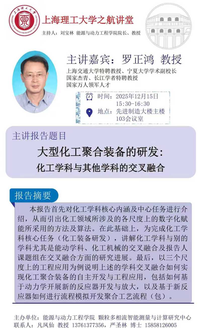 报告人简介:罗正鸿,中国化工学会会士,国家杰青、长江学者特聘教授、国家万人领军人才,上海交通大学特聘教授、宁夏大学学术副校长、“111”引智基地负责人及省部共建国家重点实验室主任。“十四五”国家重点研发计划“煤炭清洁高效利用技术”重点专项总体专家组成员,ACS旗下Ind. Eng. Chem. Res.副主编及中国化工学会化工模拟与仿真专委会副主任等。分别在南昌大学、大连理工及浙江大学获学士、硕士与博士学位,2003年博士毕业后进入厦门大学工作,2012年调入上海交通大学至今。长期从事(聚合)反应器工程研究。较为系统研究了气-固、气-液、液-液及气-液-固等多相反应器中多尺度流体动力学特征,归纳出各尺度模型耦合的“关键信息传递”方法,建立了描述流体动力学特征的多尺度计算流体力学模型,自主开发了气-固二相流两相相互作用力及界面传递模型,并成功指导开发超过25套大型工业反应器应用于包括中国石化、中国石油、国能集团宁夏煤业等公司/企业。