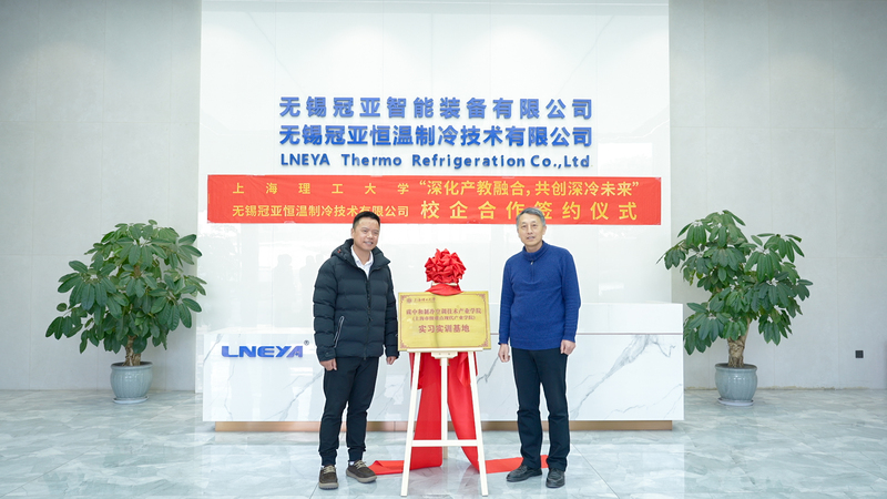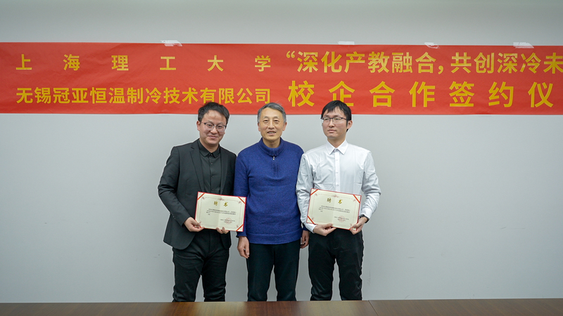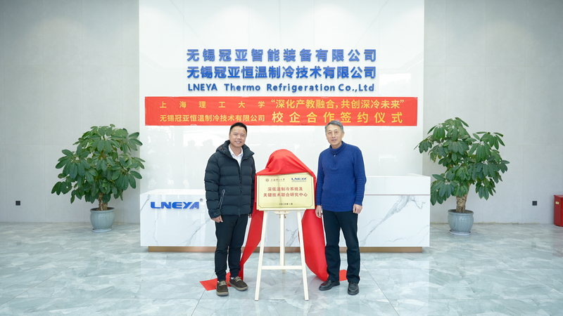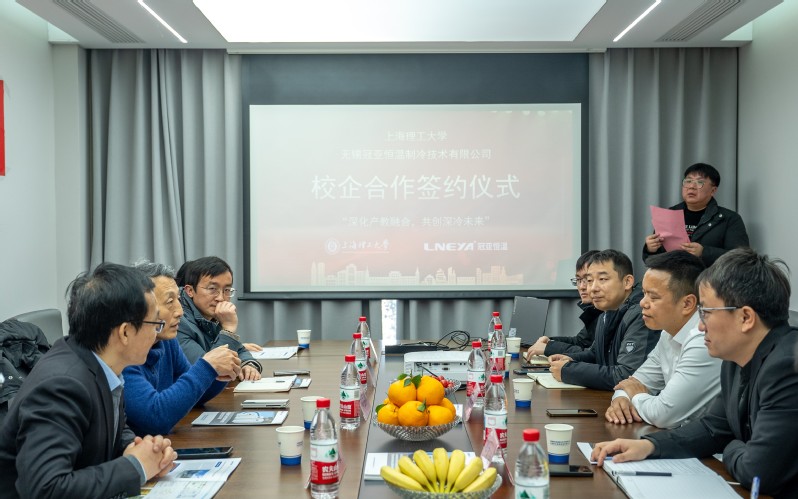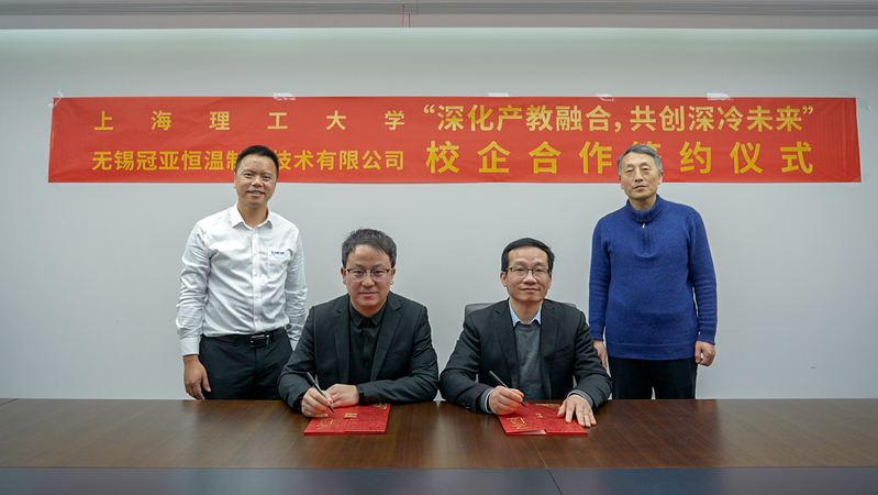 1 月 21 日上午,上海理工大学能源与动力工程学院院长刘宝林率队,上海市碳中和制冷空调技术现代产业学院执行院长陈曦、产业学院秘书长盛健等一行前往无锡冠亚恒温制冷技术有限公司,举行校企合作签约及揭牌仪式。无锡冠亚恒温制冷技术有限公司总经理颜厥枝、技术总监仝高强及相关业务负责人出席了本次活动。