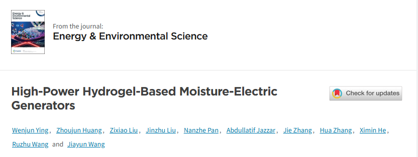 近日,在上海理工大学能动学院张华教授指导下,制冷创新团队青年骨干教师王佳韵副教授联合加州大学洛杉矶分校贺曦敏教授团队和上海交通大学王如竹教授团队,提出了一种基于PAM-rGO-LiCl三元复合水凝胶的高性能湿气发电器件。该研究成果以“高效的湿度发电机”(High-Power Hydrogel-based Moisture-electric Generators)为题发表于能源类顶刊《能源环境》(Energy & Environmental Science)(IF=30.4)上,并入选了EES期刊前10%热点论文,取得了突破性的成绩。上海理工大学能动学院博士生应汶峻、硕士毕业生黄周俊和加州大学洛杉矶分校博士生刘子虓为论文共同一作,上海理工大学为第一完成单位,能动学院张杰老师为联合作者。