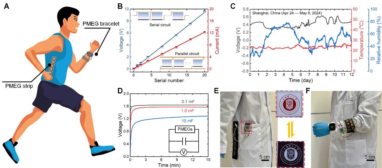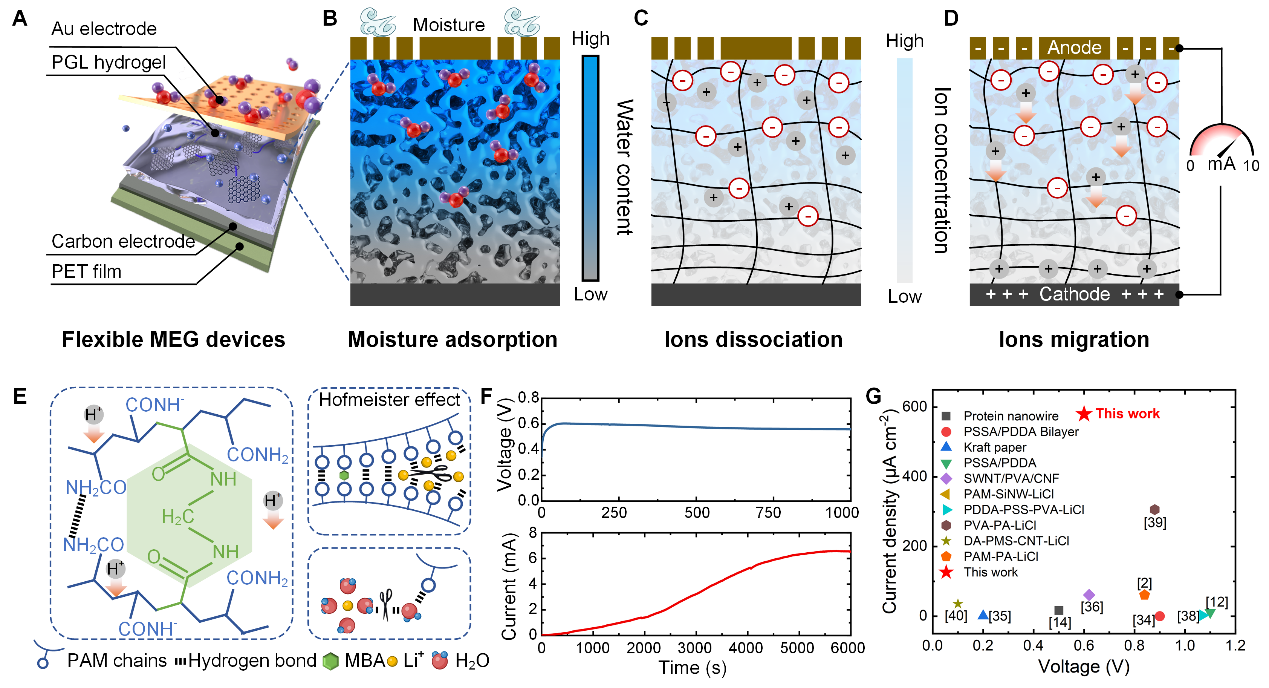 随着物联网与可穿戴健康监测的爆发式增长,传统电池“硬-重-危”的短板日益凸显,环境微能量收集成为关键。湿气(≈100 g m⁻³,无处不在)因化学势梯度蕴含可观吉布斯自由能,被视为“被遗忘的可再生能源”。然而,当前湿气发电领域仍面临关键瓶颈:由于对其发电机理的认知不够全面,且缺乏可靠的器件设计理论支撑,开发兼具高功率输出与长期运行稳定性的装置仍是一大挑战。研究团队提出了一种基于PGL水凝胶的湿度发电机,通过实验和分子模拟验证了其高效的工作机制,以准确预测PMEG的性能并指导其优化设计。该器件在30 °C、80 %RH条件下实现0.6 V开路电压与0.58 mA cm⁻²短路电流,单单元输出功率即可媲美以往数百单元并联水平。多物理场耦合模型首次将“化学-传质-电场”统一,实现性能预测与材料反向设计,为自供能柔性电子提供了一条可扩展、低成本、高功率的湿电技术路线。